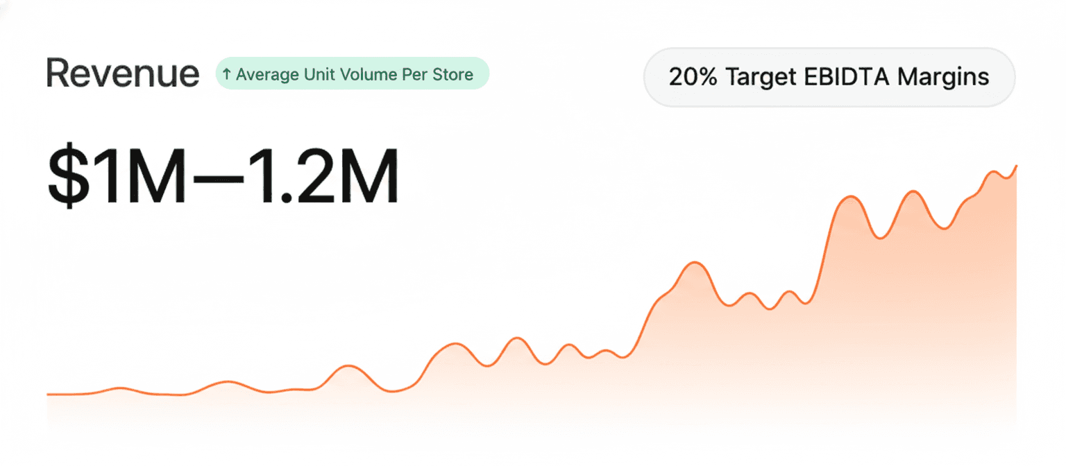 $1M-$1.2M average revenue per location with 20% EBITDA margins. 18-24 month payback period with ~$400K buildout cost per location.